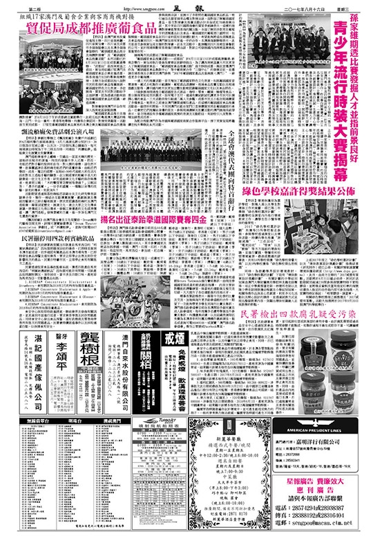 【特訊】“第13屆全國運動會”將於8月27日至9月8日在天津市舉行。特區政府將派出61人的體育代表團參加9個項目賽事,體育代表團昨日(15日)向行政長官崔世安辭行,獲得行政長官勉勵並獲授予澳門特區區旗。