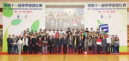 由教育暨青年局主辦、澳門田徑總會協辦的“第四十一屆學界田徑比賽”於3月9日至11日在奧林匹克體育中心舉行,共吸引了50間學校派出近2,200名運動員參加。一連三天10個組別共誕生99項冠軍,刷新18項大會紀錄。為隆重其事,閉幕儀式於3月11日下午4時30分舉行,教青局局長老柏生、中央人民政府駐澳門特別行政區聯絡辦公室青年工作部苟人民處長、教青局副局長龔志明、澳門田徑總會理事長林顯富、澳門中華教育會何少金會長、天主教學校聯會黃彪理事長、體育局馮菲處長,以及非高等教育委員會委員、各校校長及運動員代表共約900名師生出席,為運動員堅毅不屈的運動精神喝采。現場頒發4X100接力賽、個人全場總冠軍及團體冠軍等共26個獎項,嘉許表現出色的學生,並邀請了澳門田徑總會進行趣味田徑演示及澳門躲避盤協會進行躲避盤表演,現場氣氛熱鬧。獲得“個人全場總冠軍”的同學是勞工子弟學校黃佩珊同學 (女子A組)、勞工子弟學校許芯同學 (男子A組)、勞工子弟學校梁君瑜同學 (女子B組)、勞工子弟學校容榮樂同學 (男子B組)、鏡平學校黃宏樂同學 (女子C組)、慈幼中學阮毅軒同學 (男子C組)、培正中學林樂思同學 (女子D組)、澳門浸信中學林溢峰同學 (男子D組)、勞工子弟學校歐俞君同學 (女子E組)和濠江中學陳樂軒同學 (男子E組)。獲得“團體冠軍”的學校是勞工子弟學校 (女子A組)、勞工子弟學校(男子A組)、鏡平學校 (女子B組)、勞工子弟學校 (男子B組)、鏡平學校 (女子C組)、勞工子弟學校 (男子C組)、鏡平學校 (女子D組)、鏡平學校 (男子D組)、濠江中學 (女子E組)和濠江中學 (男子E組)。