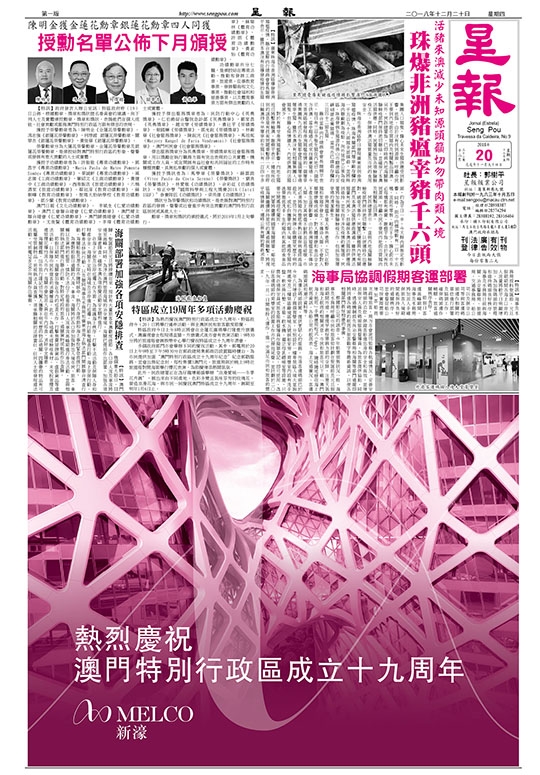 【特訊】為熱烈慶祝澳門特別行政區成立十九周年,特區政府今(20)日將舉行連串活動,與全澳居民和旅客歡度節慶。