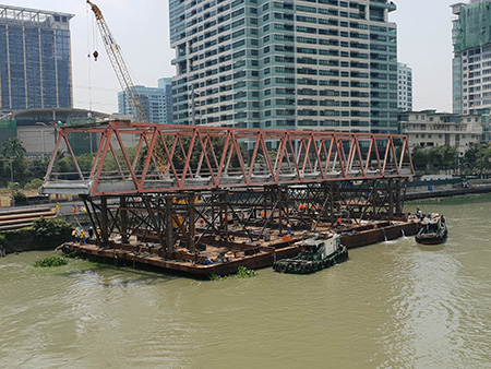 據介紹,施工隊伍預先在帕西河上兩艘700噸平板駁船上搭設浮頂支架,12日晨6時開始往船艙內注水,使得船體下沉,並運輸至主桁架正下方,精確定位後,再抽出水使得船體上浮,利用水浮力將主桁架整體頂升。頂升完成後,旋轉、平移運送至岸邊,待後續進行分節段拆除。