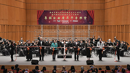 而整晚的壓軸演出,就是首次以大型管樂隊來伴唱粵曲小調,著名作家許焯勝為音樂會選出了四首廣東音樂撰詞,其中兩首粵調對唱《盛世蓮花迎雙慶》和《松山燈塔耀濠江》,由五位著名歌唱家,在管弦樂伴奏下深情演釋;演出的最後部分,由60餘人的婦聯合唱團獻上粵調大合唱《家國情懷迎雙慶》和《雙慶歡歌》,在樂隊傾力伴奏下,粵韻悠揚、歌樂齊鳴,為喜迎祖國和澳門華誕而高歌,展示用歌聲唱好中國故事、澳門故事的巾幗風采。
