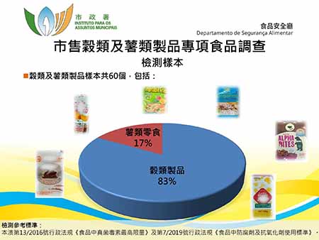 是次專項食品調查中,市政署分別抽查本澳百貨公司、超級市場等店舖出售的穀類及薯類製品,並進行真菌毒素及食品添加劑的檢測,包括黃曲霉毒素B1、赭曲霉毒素A、山梨酸、苯甲酸及二氧化硫。調查結果顯示,所有樣本均未見異常。