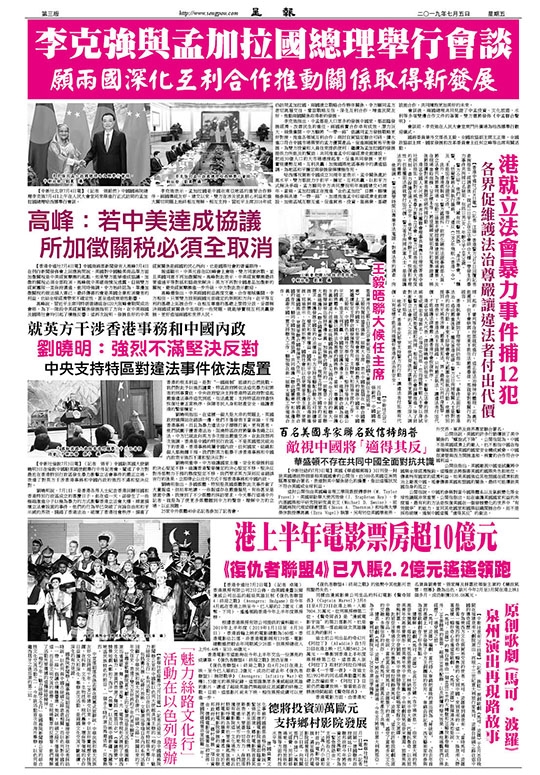 劉曉明說,7月1日,是香港各界人士紀念香港回歸祖國和香港特別行政區成立的喜慶日子。但在這一天,卻發生了一些極端激進分子以極為暴力的方式衝擊香港立法會大樓、肆意損壞立法會設施的事件。他們的行為早已突破了言論自由和和平示威的界限,踐踏了香港法治,破壞了香港社會秩序,損害了香港的根本利益,是對“一國兩制”底線的公然挑戰,我們對此予以強烈譴責。特區政府將依法追究暴力犯罪者的刑事責任,中央政府堅決支持香港特區政府對這起嚴重違法事件追究到底,依法處置;支持特區政府盡快恢復社會正常秩序,保障市民人身和財產安全,維護香港的繁榮穩定。