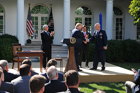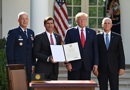 美軍太空司令部成立儀式當天在白宮玫瑰園舉行。在副總統彭斯、防長埃斯珀以及太空司令部司令約翰·雷蒙德陪同下,特朗普宣佈上述決定。埃斯珀隨後簽署了成立該司令部的國防部文件。