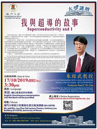 講座上,朱經武將介紹超導的歷史,並分享超導研究的特色和樂趣,以及長期的超導研究如何豐富其人生。講座將於10月17日(周四)下午3時30分在澳大劉少榮樓劉佐德伉儷演講廳(E4-G078)以英語輔以普通話即時傳譯進行。