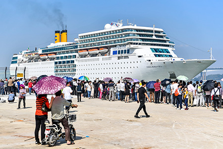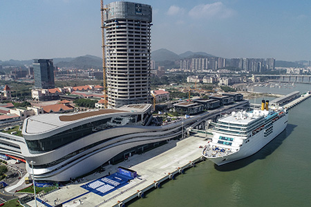 目前建設的一期工程岸線總長770米,建成22.5萬總噸和10萬總噸郵輪泊位各1個,以及建築面積約6萬平方米的航站樓,可停靠目前世界上最大的郵輪,年設計通過能力達75萬人次。