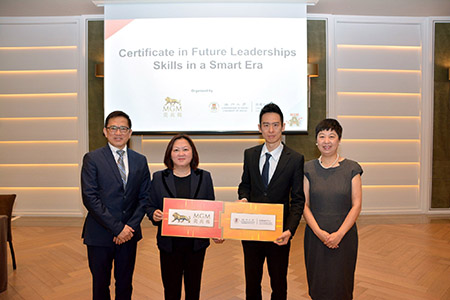 美高梅早前為是次證書課程舉行開幕典禮,由美高梅人力資源行政副總裁余婉瑩、人力資源發展及培育副總裁陳來源、人力資源發展及培育高級經理梁思寧、澳大工商管理學院院長陳靖涵及持續進修中心主任劉丁己主禮,並進行了雙方合作儀式。