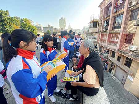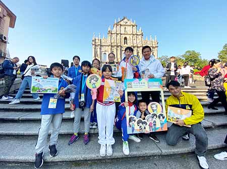 司警局滅罪小先鋒學員聯同文化局的小小導賞員一行約四十人,於大三巴一帶向市民、遊客宣傳保護文物和防罪注意事項。期間,學員們更發揮朋輩正面影響力,向途經的青少年講解文化遺產保護和多種防罪資訊,冀透過他們將有關資訊傳遞給更多青少年,一起防罪守法。