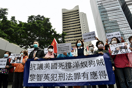當日,“保衛香港運動”一行人自中環遮打花園遊行至美國駐香港和澳門總領事館,他們沿路打出五星紅旗及香港特別行政區區旗,舉著標語,高喊口號“假民主真霸權、干涉別國內政”,批評美國共和黨參議員斯科特及美國國務院發言人奧塔格斯在黎智英被捕及被落案起訴的當日的聲援。