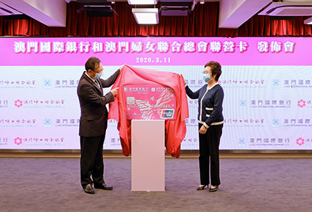 【特訊】2020年3月11日,適逢澳門婦女聯合總會成立70周年,澳門國際銀行與澳門婦女聯合總會攜手推出「婦聯總會聯營卡」,並於水坑尾婦聯大廈(婦聯總會)舉行發佈會,出席當日發佈會的領導及嘉賓包括澳門國際銀行執行董事兼總經理焦雲迪、副總經理胡倫、營銷副總監汪洋、信用卡部總經理陳少端、零售業務管理部副總經理林智雄、板樟堂分行總經理黃則祺、辦公室助理總經理蘇長恩、板樟堂分行助理客戶服務經理洪小敏;澳門婦女聯合總會會長賀定一,理事長林婉妹,副會長容永恩,副理事長袁小菱、莊玲玲、羅萍,副監事長林細妹,財務主任葉翠萍。