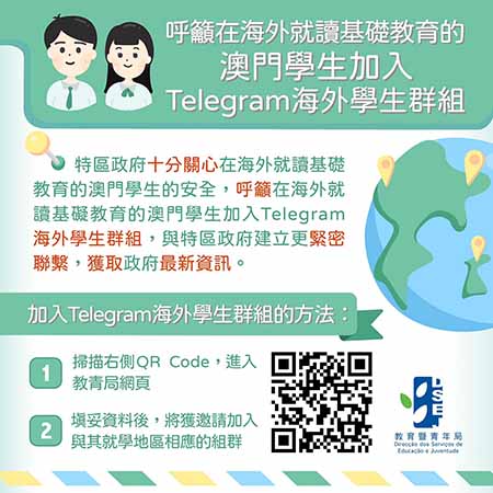 【特訊】鑒於新型冠狀病毒肺炎在全球蔓延,特區政府十分關心在海外就讀基礎教育的澳門學生的安全,教育暨青年局與高等教育局合作,將高等教育局現有Telegram海外學生群組擴大至包含高等教育和基礎教育的學生,特區政府希望與在不同國家就讀基礎教育的澳門學生保持更緊密的溝通和聯繫,適時發布政府最新的關懷措施和防疫、抗疫等資訊。呼籲在海外就讀基礎教育的澳門學生和家長踴躍加入群組,教青局已設立專門網頁(https://s.dsej.gov.mo/qa/Q0000109/),學生和家長填妥個人資料和在學資料,將獲邀請加入與其就學地區相應的群組。