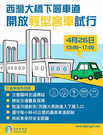 交通事務局提醒,輕型客車駕駛者在使用下層車道時須留意附近道路的臨時交通標誌及聽從交通警員現場指揮,盡量取道颱風期間的行車路徑,即由河邊新街或民國大馬路進入大橋下層入口。同時,須遵守車道內每小時40公里的最高車速限制及注意與前車保持安全距離,避免發生意外。