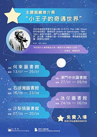 【特訊】適逢世界著名兒童小說《小王子》(The Little Prince)的作者安東尼.聖修伯里(Antoine de Saint–Exupéry 1900–1944)誕辰120周年,文化局公共圖書館於7月13日至9月20期間舉辦“小王子的奇遇世界”主題館藏推介展,並分別於何東圖書館、澳門中央圖書館、石排灣圖書館、氹仔圖書館以及沙梨頭圖書館巡迴展出60多本與小王子、其作者安東尼.聖修伯里、飛行與天文相關的館藏實體圖書、電子書及電子雜誌,帶領讀者透過閱讀,展開奇幻旅程。展覽免費入場,歡迎市民參觀。