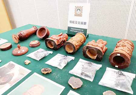 【特訊】司警再揭發有跨國販毒集團利用郵包運毒案件,發現在泰國寄出經香港抵澳的包裹,內裏的兩個木製神像和兩個木製圓桶底均被挖空,並藏四包重約二百六十克的冰毒,市價值逾八十五萬元。司警拘捕三名負責接收郵包的菲律賓裔男女,其中兩人為澳門居民,司警正追查毒品來源及集團主腦的下落。