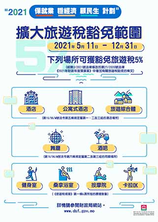 根據經第3/2021號法律修改的《2021年財政年度預算案》中有關旅遊稅豁免的條文,相關場所可獲豁免自2021年5月11日起至12月31日止之5%旅遊稅。旅遊服務場所如在豁免期內向消費者不當收取旅遊稅,一經發現,除須繳納相關稅款外,還可依法被科處罰款。另外,未獲適當發牌的場所,以及在發票或等同文件內不當地載有稅款的結算的場所,將不獲豁免。