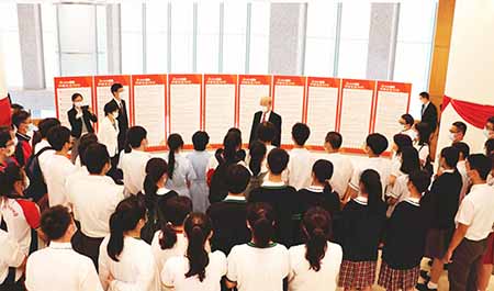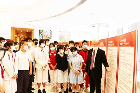 劉顯法特派員歡迎師生訪問公署,並帶領大家參觀公署“百年黨史百句名言”展板,他用一個又一個故事,深入淺出地解讀毛澤東、鄧小平、習近平等黨的領袖在不同歷史時期的名言。從“中國人從此站立起來了”“走自己的道路,建設有中國特色的社會主義”到“我國脫貧攻堅戰取得了全面勝利”,講述了中國從站起來、富起來到強起來的歷史性飛躍。劉特派員還講解了習近平總書記“幸福都是奮鬥出來的”等名言,勉勵特區青年傳承愛國愛澳精神,抓住“好像早晨八九點鐘太陽”的青年時期,刻苦努力、銳意創新,成為特區和國家發展所需的棟梁之才。