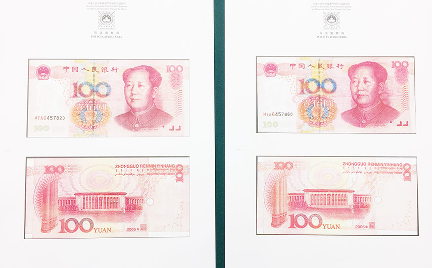 司警表示,於去年的一月十八日,男事主被涉案的張女搭訕,要求兌換港元,張女交出一萬元人民幣後,事主給她一萬一千四百港元現金。事主其後帶同該筆人民幣到路氹某賭場的賬房,打算再換回港元,被職員發現是假鈔,司警接報到場處理,起出八十四張面值一百元的假人民幣,另有十六張是真鈔。該批假鈔分屬兩組編號「MTA6457823」及「MTA6457860」,司警經檢查後,發現有關假鈔仿真度高,鈔票厚身及有金屬線,部分故意變成舊鈔,容易令人混淆。