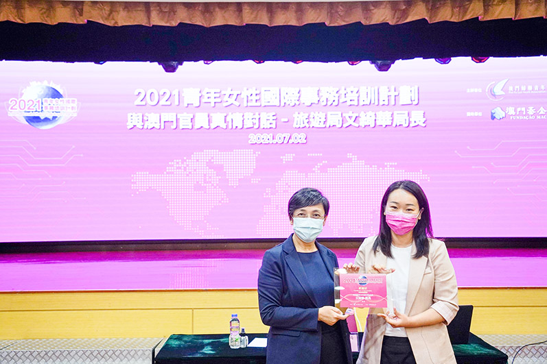 【特訊】由澳門婦聯青年協會主辦、澳門基金會贊助的「二○二一青年女性國際事務培訓計劃」,日前在婦聯綜合服務大樓五樓何賢禮堂舉辦「與澳門官員真情對話」分享會,邀請旅遊局局長文綺華擔任主講嘉賓,分享本澳旅遊業最新概況、疫情後的復甦措施及未來發展策略等。婦聯青協會長黃潔貞、理事長呂綺穎,國培籌委會主席方慧超、一眾籌委和近八十名學員出席活動。