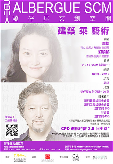 【特訊】由婆仔屋文創空間主辦及澳門建築師協會合辦的「建築 X 藝術」講座將於2021年11月1日(星期一)傍晚6時30分至晚上10時15分在婆仔屋文創空間D1室舉行,講座邀得獨立策展人及博物館顧問羅怡女士及劉曉都建築師擔任主講嘉賓。參與者請先於網上登記(連結:https://forms.gle/Nc8tHLbjDsS9JqPZA或掃描二維碼),並於10月29日(星期五)或前到婆仔屋文創空間辦公室內繳交報名費用(繳款後才算是完成報名),報名費為澳門幣450元。