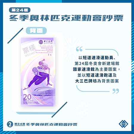 中國銀行發行的第24屆冬奧鈔票,正面以第24屆冬奧會徽“冬夢”及中國銀行澳門分行大廈為主要圖案;鈔票背面以短道速滑運動員、第24屆冬奧會新建場館國家速滑館為主要圖案,並以短道速滑跑道和大三巴牌坊為背景圖案。每名澳門居民可登記兌換2張鈔票,涉及兌換金額為40澳門元。