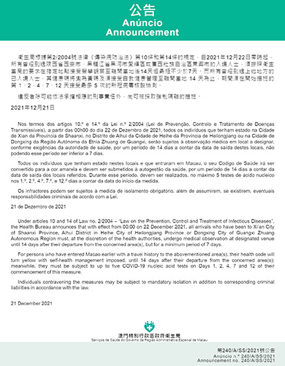 【特訊】新型冠狀病毒感染應變協調中心(下稱「應變協調中心”)宣佈,因應陝西省、黑龍江省及廣西壯族自治區的疫情變化,自2021年12月22日零時起,所有曾經到過陝西省西安市、黑龍江省黑河市愛輝區或廣西壯族自治區東興市的入境人士,須按照衛生當局的要求在指定地點接受醫學觀察至離開當地後14天但最短不少於7天。