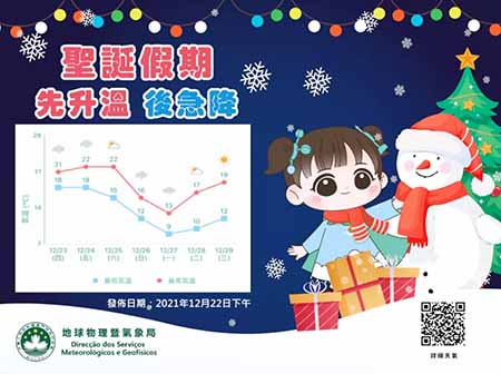 氣象局又指出,預料一股強烈的冬季季風將於聖誕節當日(二十五日)抵達華南沿岸平安夜(二十四日)本澳氣溫先略為回升,聖誕節(二十五日)起北風將會增強,伴隨降雨,氣溫顯著下降,預料下週一(二十七日)的最低氣溫將下降至攝氏九度或以下,天氣濕冷,聖誕假日天氣先暖後冷,呼籲市民應留意天氣變化,做好低溫預防措施。氣象局稱,今日天氣大致多雲,稍後有幾陣雨,吹二至三級東北風,氣溫約為攝氏十八至二十一度,相對濕度介乎百分之七十至九十五之間,預測最高紫外線指數約為四,級別屬於中等。