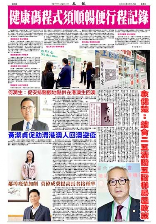 鄰埠香港近期本地確診人數不斷創單日新增數字新高,僅2月11日單日就錄得本土新冠病例1325宗,疫情發展態勢不容樂觀,街坊總會副理事長兼秘書長莫偉成希冀政府加強宣傳力度,推動長者及慢性病患者等高危人群盡快接種疫苗,提高個人防護力,降低重症、死亡風險,並且積極做好加強針接種提醒工作,呼籲居民接種疫苗,積極抗疫,共同建設防疫安全城市,為澳門經濟復甦助力。