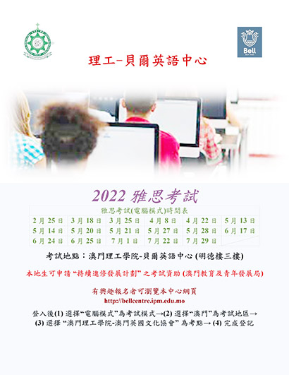 澳門理工學院-貝爾英語中心持續為澳門各中小學、社會各界及大中華地區提供優質的英語大學課程及職業技術教育的機構,服務內容包括英語課程、專業英語教材開發、語言評估及測試和教師培訓等。多年來亦堅持使用先進的教學方法、度身編選的教材以及完善的多媒體技術幫助大眾提升英語水平,提供多元化之英語培訓課程及語言水平測試,致力協助特區政府打造澳門為國際英語語言測試及培訓基地。更多詳情,請瀏覽澳門理工學院-貝爾英語中心網站: http://bellcentre.ipm.edu.mo,查詢電話: 8599 3162。