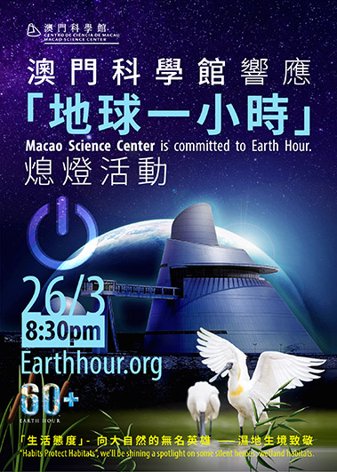 「地球一小時」於2007年在澳洲悉尼首次舉辦,現已發展成為全球最大型的集體環保活動。今年活動以「生活態度」為主題,鼓勵公衆以生活態度守護生態,向大自然的無名英雄——濕地生境致敬,預計全球將有超過190個國家、7,000多個城市,包括北京、上海、廣州、香港等地參與活動,而澳門科學館已連續第12年參與「地球一小時」,期望鼓勵公衆實踐綠色生活態度。