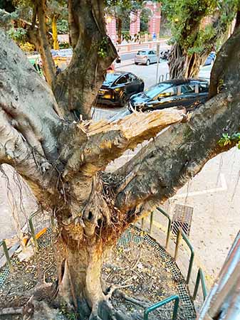 市政署人員經現場初步檢查,涉事樹木為一棵細葉榕,斷裂樹枝枝葉茂盛,直徑約二十五公分,樹枝木質結構為實木,未見有蟲害跡象,斷裂口向上,初步判斷起因為樹枝疑受自身承重影響,引至撕裂。市政署翻查記錄,該樹最近一次巡查為二零二一年二月,樹木狀況正常。