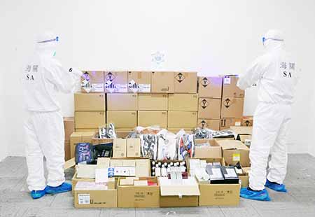 行動中,海關在該店起出一批懷疑走私的美容化妝產品和波鞋,正點算貨品的數量及價值。