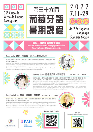 線上公開講座向大眾免費開放,葡萄牙語作家José Luís Peixoto、Nuno Júdice和Adriana Lisboa將分別以《21世紀首批葡萄牙小說家》(7月11日,19:00)、《詩歌是什麽》(7月20日,19:00)及《文學與自然界》(7月29日,19:30)爲題演講。有興趣人士屆時可登入以下網址參加:https://umac.zoom.us/j/93170073369?pwd=ZlRwcjcraDBLQzA4UUtjYzliSzUxQT09.,與作家直接互動和對話,加深對葡語文學和文化的瞭解。