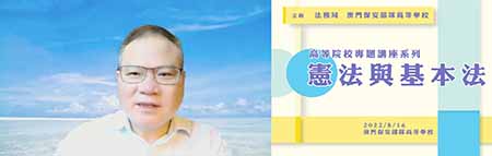 【特訊】為持續向本澳各高等院校學生推廣《憲法》與《基本法》,並在配合特區政府疫情防控工作下,法務局與澳門保安部隊高等學校於八月十六日以線上直播方式合辦「高等院校《憲法》與《基本法》專題系列活動」,邀請了澳門大學法學院蔣朝陽教授擔任主講嘉賓,共有約一百一十名學員一同參與。