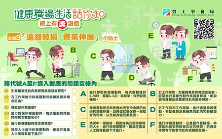 第三期有奬遊戲由即日起至十月十六日期間推出,主題為『遠離勞損 齊來伸展』小貼士,透過問答遊戲,使參加者認識肌肉筋骨勞損的成因,並鼓勵參加者定時進行伸展運動,可以減低肌肉筋骨勞損和受傷的機會。歡迎有興趣的市民可透過勞工局手機應用程式或掃描二維碼直接參與有獎遊戲。