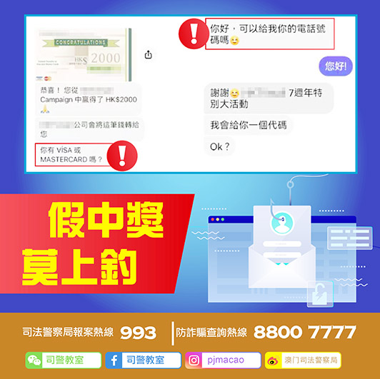 鑒於過往亦曾發生有市民的網絡社交平台帳戶或通訊軟件帳戶被不明人士入侵,並向通訊名單上的親友發送訊息,藉參與抽獎活動而套取個人資料或進行詐騙的事件,司警局呼籲市民,當有人透過網絡要求提供個人或財務資料,甚至索要金錢時,應特別提高警覺。