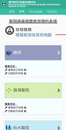 1.使用者可點按新冠病毒核酸檢測預約系統主頁上方連結或直接使用以下連結進入地圖:https://app.ssm.gov.mo/rnastation/map;
