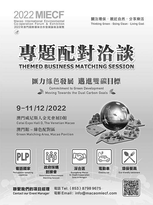 【特訊】「2022年澳門國際環保合作發展論壇及展覽」(2022MIECF)將於12月9至11日舉行。澳門貿易投資促進局持續通過綠色配對等服務,助力企業向綠色轉型發展,擴展環保業務,共同推進「碳中和」 及「零排放」目標。