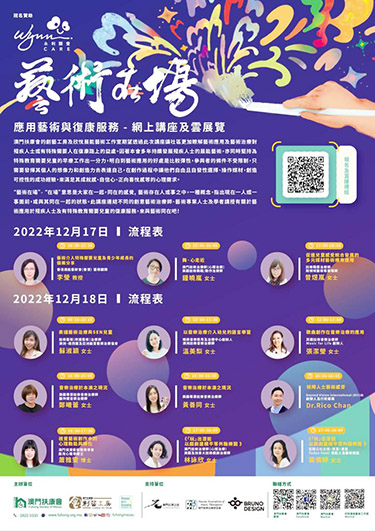 為了讓社區更加了解藝術應用及藝術治療對殘疾人士或有特殊需要人士在復康路上的益處。澳門扶康會轄下創藝工房及欣悅展能藝術工作室將於12月17日至18日舉行「『藝術在場』應用藝術與復康服務網上講座及雲展覽」。「在場」意思是大家在一起、同在的感覺。透過線上講座連結不同的創意藝術治療師、藝術專業人士及學者,讓參加者對藝術治療如何應用於殘疾人士及有特殊教育需要兒童的復康服務上有更深認識,讓藝術治療能更廣泛被應用在復康服務上,促進他們融入社區,發揮所長。
