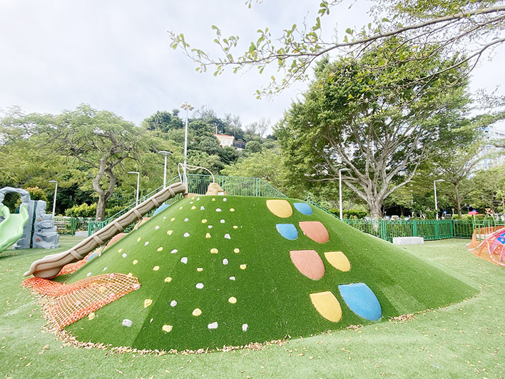 為配合不同年齡層兒童的發展需要,鼓勵通過遊戲鍛鍊身體,增設多款適合五至十二歲的攀爬遊具,包括兒童攀爬吊繩組合、仿岩壁的攀登遊具、人造草皮鋪設小山丘、特色的蹺蹺板等,提供觸覺、感官、運動等遊戲體驗。場內亦增設適合二至十二歲兒童遊具,具備幼童攀爬的圓頂、弧形平衡木、積木造型攀爬遊具等,既增加遊樂趣味性,又能鍛鍊協調能力。遊樂區優化後,除擴大兒童遊樂場面積,增加多元化的兒童遊戲設施外,亦豐富了種植品種,例如:魚木、粉紙扇、星點變葉木等多種彩葉及開花植物,提升綠化景觀。