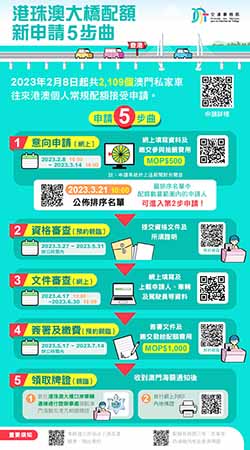 【特訊】交通事務局表示,特區政府即日(1月26日)起推出2,109個澳門私家車往來港澳個人常規配額予公眾申請。經評估需求情況,是次將以個人配額供申請,有意申請並符合資格人士可於2023年2月8日上午10時至3月14日下午6時前到交通事務局網頁https://epay.dsat.gov.mo提交意向申請表及繳交參與抽籤費用澳門元伍佰元,上述配額有效期為三年,每個配額費用為澳門元壹仟元,相關費用一經繳付不予退還。