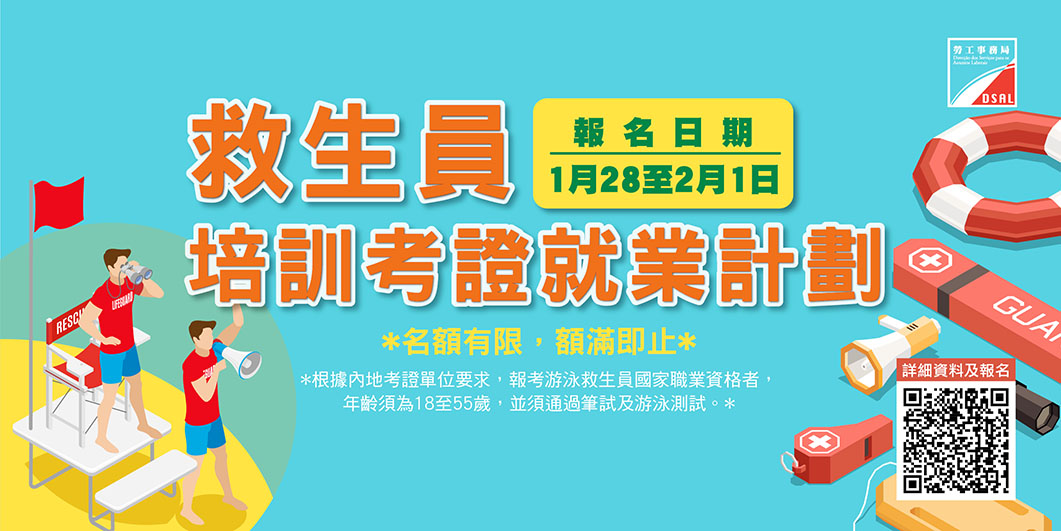 【特訊】為配合澳門經濟適度多元發展,促進澳門居民多元就業,勞工局與新濠天地度假村有限公司(下稱新濠)合作推出「救生員培訓考證就業計劃」 (下稱計劃)。此外,為協助居民了解救生員的職業發展前景及入職的工作條件,將舉辦職涯講座及職場導覽活動,有意參加導覽活動的澳門居民可於1月28日至2月1日透過網上報名。