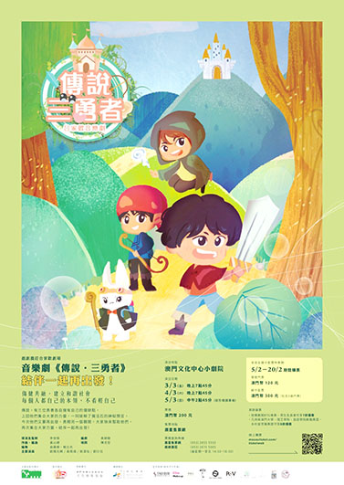 音樂劇《傳說‧三勇者》,作品中的曲目由香港音樂劇界炙手可熱的音樂人黃以禮作曲及編曲;澳門著名音樂人陳志宏(金鷹)填詞;澳門新進編劇黃穎駿創作;澳門街舞先鋒翁靄楊及香港編舞鮑立光聯合編舞;澳門資深戲劇工作者李俊傑(Jacky哥哥)擔任導演及監製,帶領一班新生代演員:歐陽兆樺、黃偉燐、蔡潔怡、劉衍滔及一眾小朋友演員和觀眾一起勇闖難關,在愛與勇氣、學習聆聽中結伴前進!