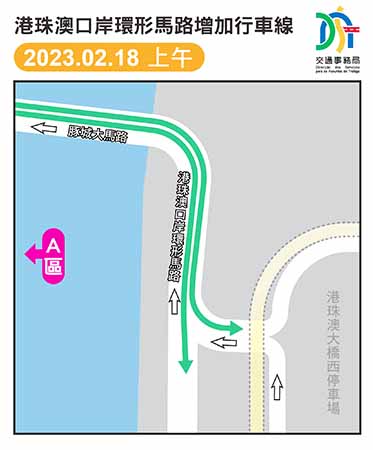 【特訊】交通事務局表示,隨著新城填海A區建設發展及進出港珠澳大橋人工島之車流量日益增加,A區之交通需求呈持續增長趨勢。為優化A區往港珠澳大橋人工島的行車安排,交通事務局經評估周邊的交通狀況及道路條件,將靠近港珠澳大橋人工島入口的一段港珠澳口岸環形馬路改為雙線行車,增加一條行車線,以便車輛分別駛往港珠澳大橋澳門口岸的出境車道、入境大堂及西停車場等方向,減少該路口的車輛交織情況。新增之行車線將於2月18日(周六)上午完成地面標線後隨即開通。
