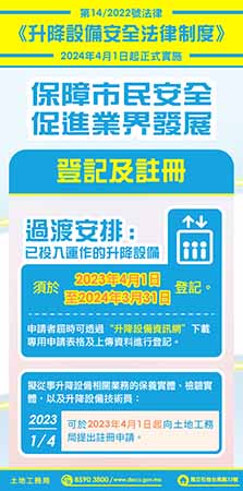 升降設備的責任人(即管理公司、業主會或場所經營者等),有責任確保設備得到日常保養及定期檢驗,使其處於良好的安全條件下運作。按照法例,由今年(二○二三年)四月一日起,責任人須於法律正式實施前一年內為已投入運作的升降設備向土地工務局進行登記,而實際提供相關升降設備保養服務的保養實體應予以協助,工務局會為每一部完成登記的升降設備發給編號。