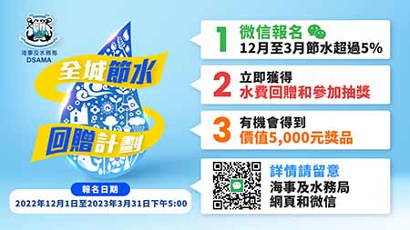同時,局方現正舉辦全城節水回贈計劃,鼓勵居民節約用水,自來水用戶只要報名並達到節水目標,除了可獲水費回贈,還可自動參與抽獎,有機會獲得最多5,000元的超市禮券。活動報名期於3月31日截止,局方呼籲社會各界到澳門海事及水務局的微信公眾號報名參加,共同支持節水工作。