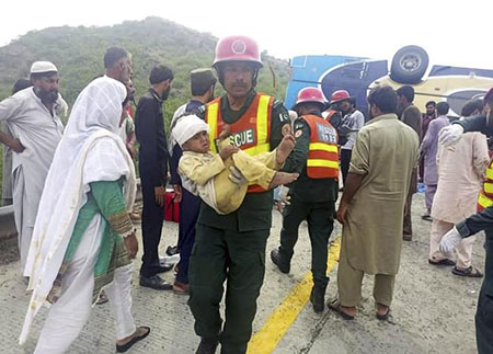 巴基斯坦交通管理部門一名負責人在接受新華社記者採訪時說,事故發生在旁遮普省傑格瓦爾地區一條高速公路上,一輛從首都伊斯蘭堡駛往該省省會拉合爾的客車由於剎車失靈翻車。死者中包括5名婦女和3名兒童。警方和救援人員已趕到現場,傷者已被送往醫院救治,部分傷者情況危急,預計死亡人數會上升。