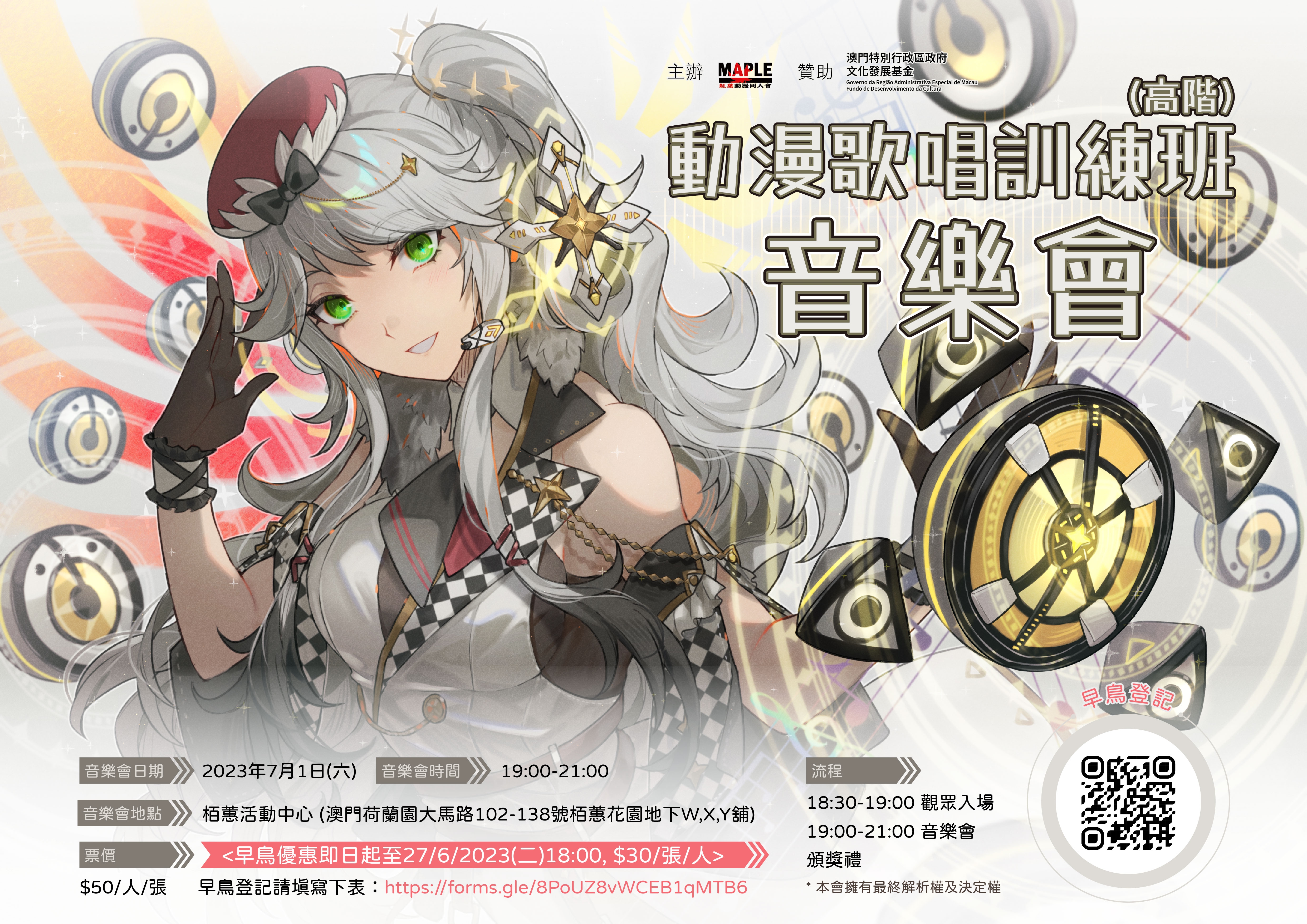 【特訊】動漫歌唱訓練班(高階)音樂會將於7月1日(星期六)晚上七時假栢蕙活動中心舉行。音樂會演出學員經過選拔誕生,並安排在10個課程中進行培訓, 課程由專業歌唱導師指導,為提升表演者自身基礎能力,加強動漫歌唱表演者對演出質素的追求,開拓本澳動漫音樂會市場。演出者包括(排名不分先後):鄧樂怡、楊穎芝、彭肇鏘、彭子桁、黃楚婷、陳芷懿。