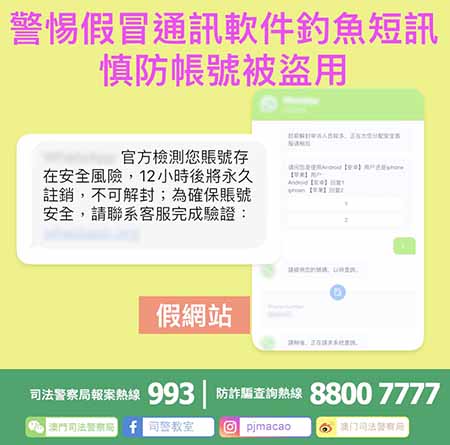 【特訊】近日,司法警察局發現有不法分子假冒官方通訊軟件公司向市民發送附有不明連結之短訊,訛稱其手機通訊軟件帳戶「存在安全風險及將被註銷」,誘騙市民點擊短訊內的連結及跳轉至假冒客服聊天機械人,隨後事主輸入手機號碼及驗證碼等資料,騙徒企圖藉此盜取相關通訊軟件的帳號使用權。