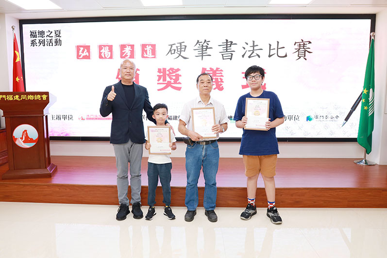 【特訊】由澳門福建同鄉總會主辦,澳門福建學校和澳門福建同鄉總會婦幼委員會協辦的福總之夏系列活動-弘揚孝道「硬筆書法比賽」,日前已經完成比賽並在三個組別中分別選出金、銀、銅和優秀獎合共39份得獎作品。所有獎項於8月5日在福總會址進行頒獎。出席頒獎的嘉賓有澳門福建同鄉總會會長陳明金、榮譽會長吳在權、執行會長宋碧琪、理事長黃天松、秘書長李少群、副會長兼婦幼委員會主任蘇薇蘋。