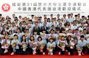 【中新社香港8月9日電】(記者 韓星童)香港特區政府9日在香港國際機場舉行歡迎儀式,迎接成都大運會中國香港代表團成員凱旋。